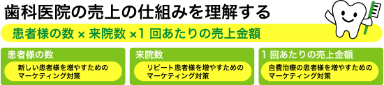 つまり、歯科医院において、売上を増加させる方法は、大きく分けると、3パターンにも上るのです。どこに力を入れていきたいかの判断は、恐らく先生方の掲げている経営理念が最も影響を及ぼすのではないでしょうか?
